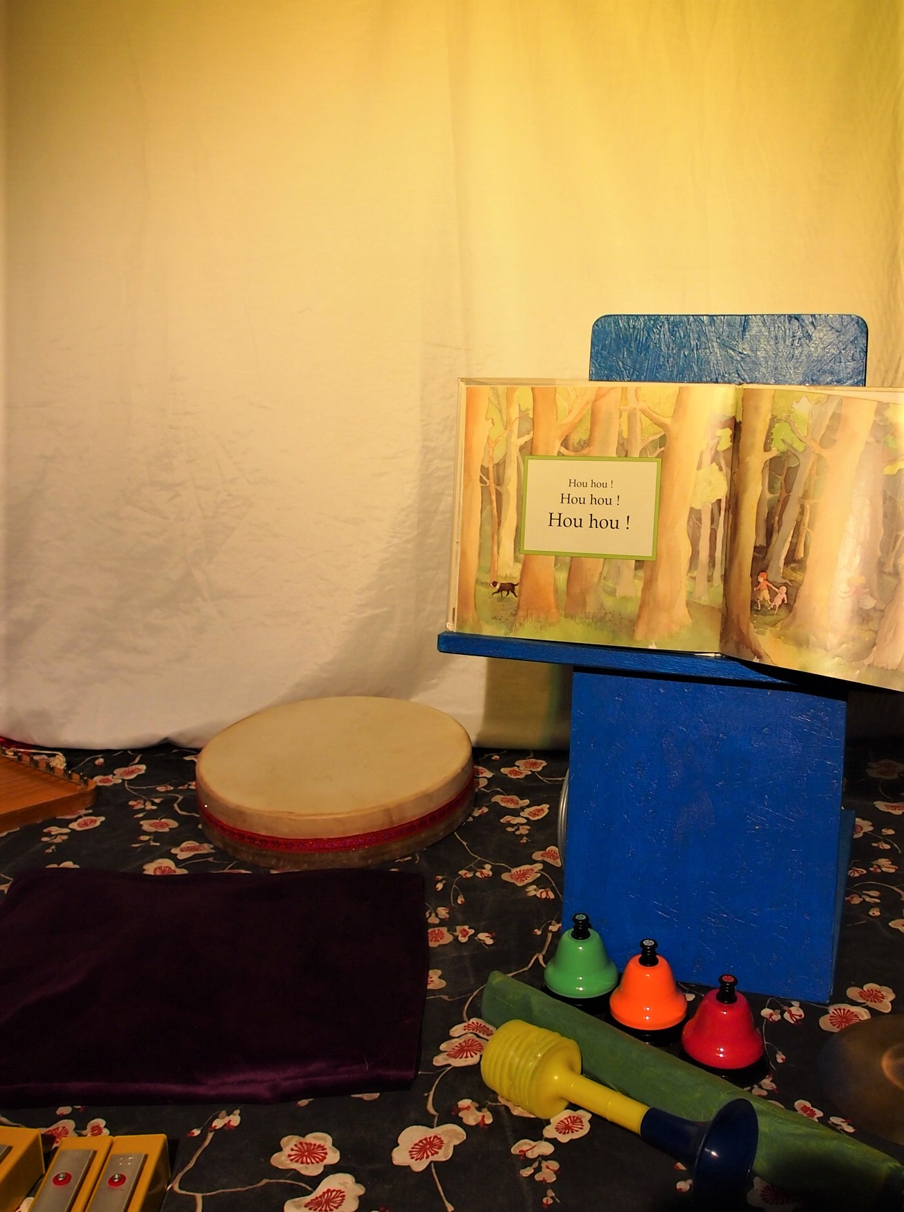 Si le groupe est restreint, la lecture peut être suivie d’un temps de découverte et de manipulation des objets sonores et instruments utilisés pendant la racontée. Ce moment est agrémenté de comptines ou jeux de doigts, rythmes… (12 enfants environ accompagnés des parents ou référents /possibilité d’organiser plusieurs temps d’éveil si le groupe est plus important).